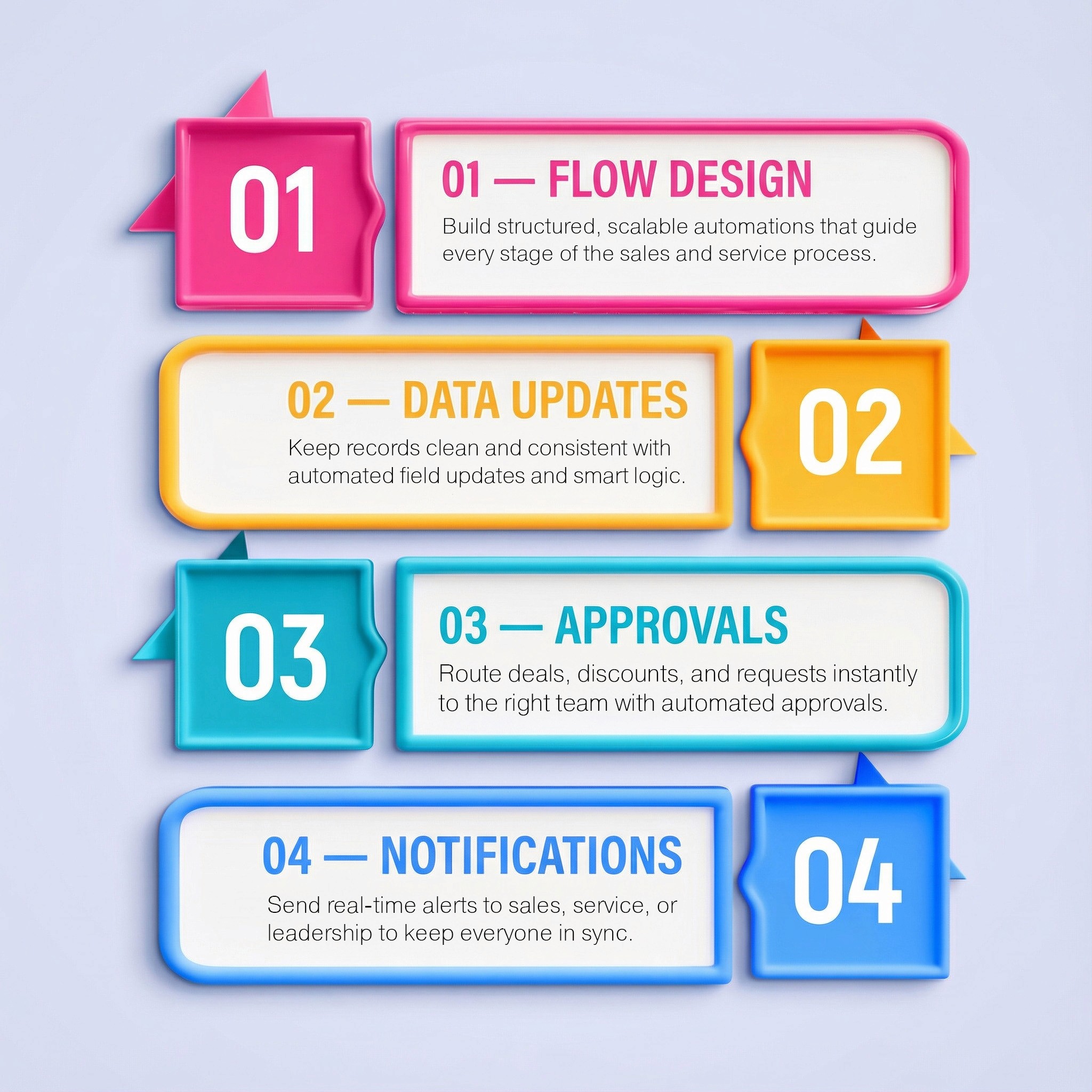 We create essential flows, lead routing, follow-ups, task reminders, to reduce manual work and keep your process running smoothly.